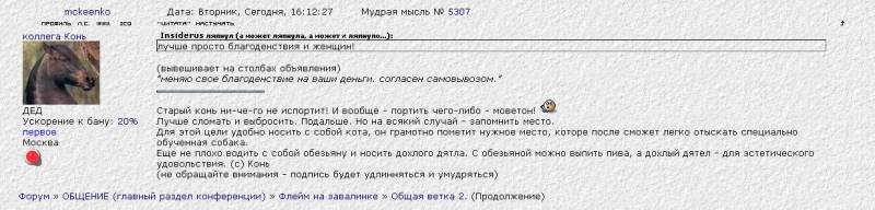 | Quote (Insiderus) лучше просто благоденствия и женщин! (вывешивает на столбах объявления) "меняю свое благоденствие на ваши деньги. согласен самовывозом."