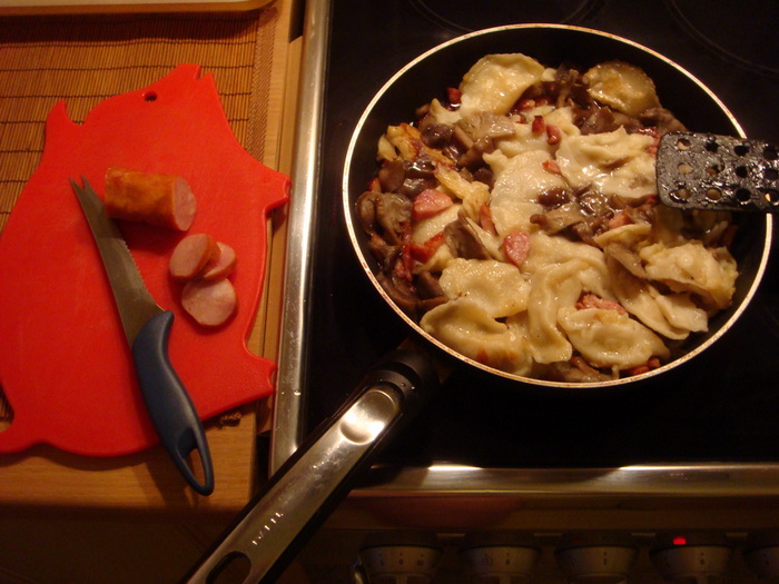 | Холостяцкая вечерия "Адмирала": Итак, приступим-с, ингридиенты - вчерашние недоеденные вареники (с "картоплей".. .. но так написано на упаковке), колбаска "домашняя".. куриная (нарезанная небольшими кусочками), немного лучка, - и, конечно-же, маринованные опята Всю енту ботву выкладываем на заранее разогретую сковороду (которую я вчера так и успел стырить ) и жарим пока варешки не примум золотисто-поджаренный вид. К сему блюду овощной салатик Итого, получаем - вот енто: